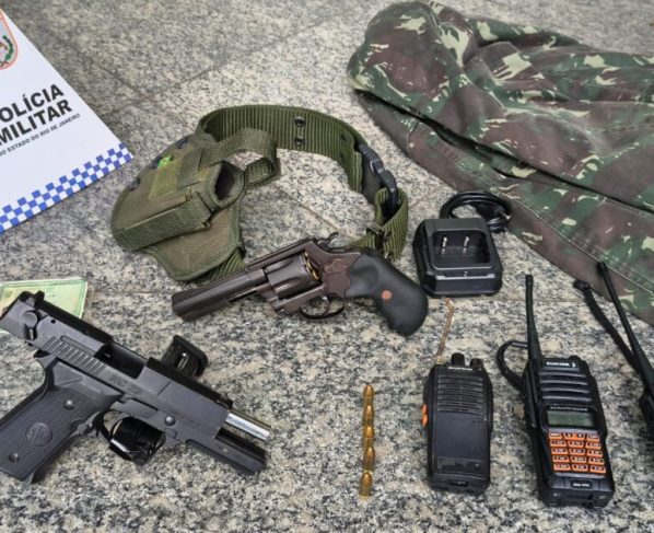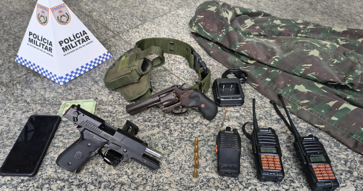 Após a entrada no imóvel, os policiais realizaram buscas e encontraram uma pistola calibre 9 mm com cinco munições, um revólver calibre .38 com seis munições, três rádios transmissores, uma base de carregamento, um aparelho celular, um coldre e uma gandola. Buscas foram feitas na região para localizar os demais envolvidos, mas ninguém foi preso.