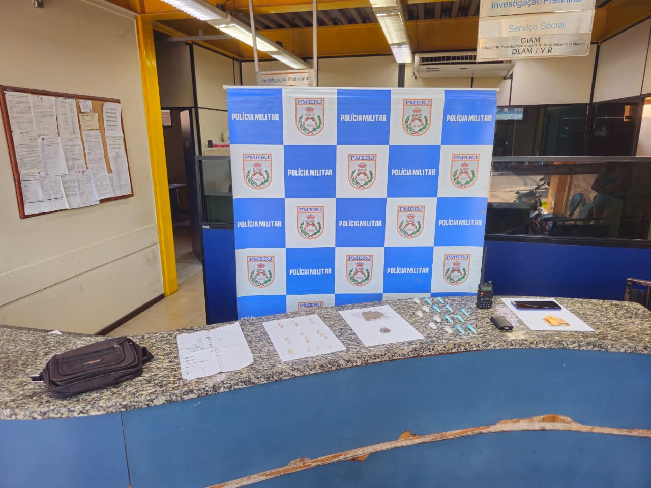 Durante a revista, os policiais apreenderam 15 pinos de cocaína, 18 pedras de crack, dois pedaços de maconha, além de um rádio comunicador, uma folha com anotações do tráfico, um celular e R$ 20. O material também estava dentro de uma bolsa de tira colo utilizada pelo suspeito.