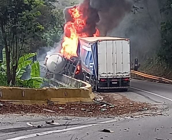 Segundo a Polícia Rodoviária Federal, por volta das 14h45, uma carreta, que transportava gasolina, tombou na pista sentido Rio de Janeiro. Em seguida, uma carreta, que transportava cerveja, colidiu na traseira da outra e ambas pegaram fogo.