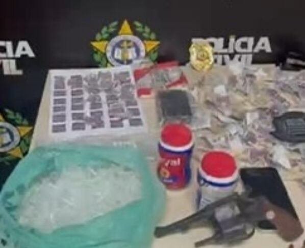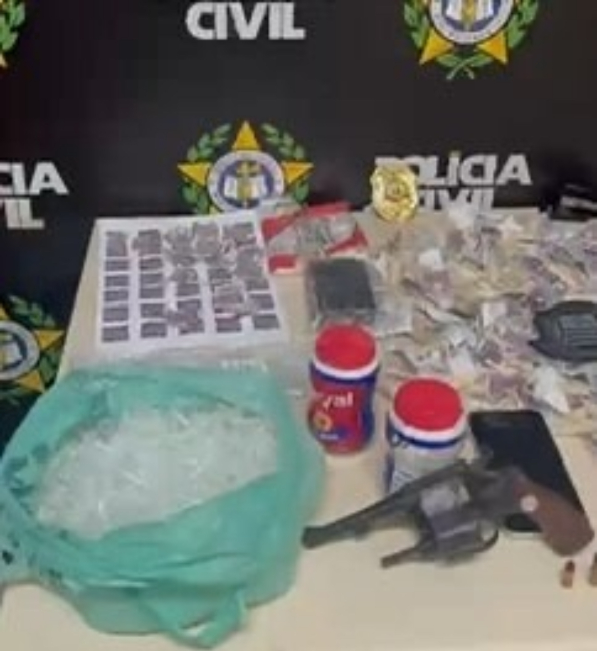 Durante o cumprimento do mandado de prisão, os policiais também encontraram com o homem um revólver, munições e 250 pinos de cocaína. Ele foi preso em flagrante por porte ilegal de arma e tráfico de drogas.