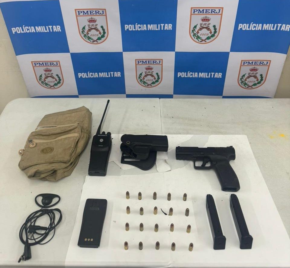 Com ele, foram apreendidos uma pistola turca da marca Canik, dois carregadores, 20 munições calibre 9 mm, além de um rádio transmissor, um coldre e a bolsa tiracolo usada para ocultar o armamento.