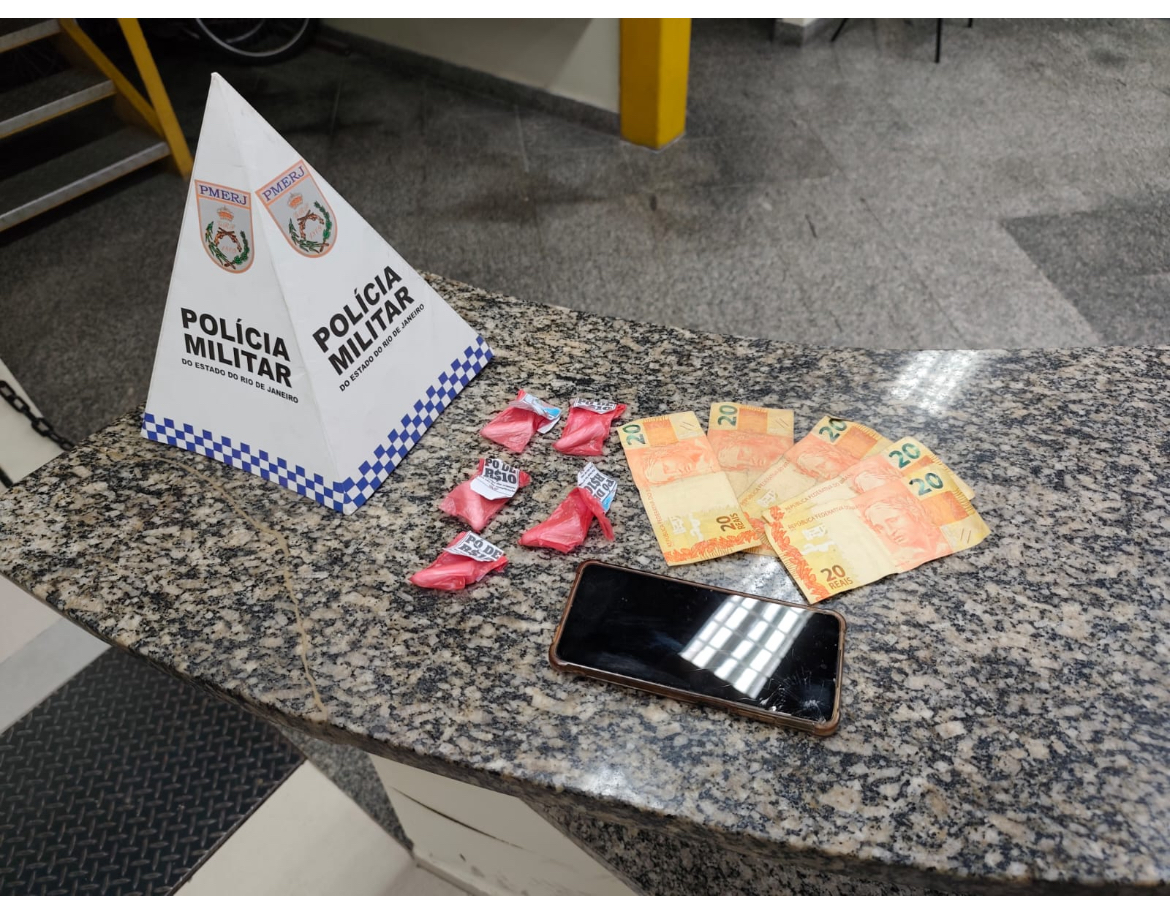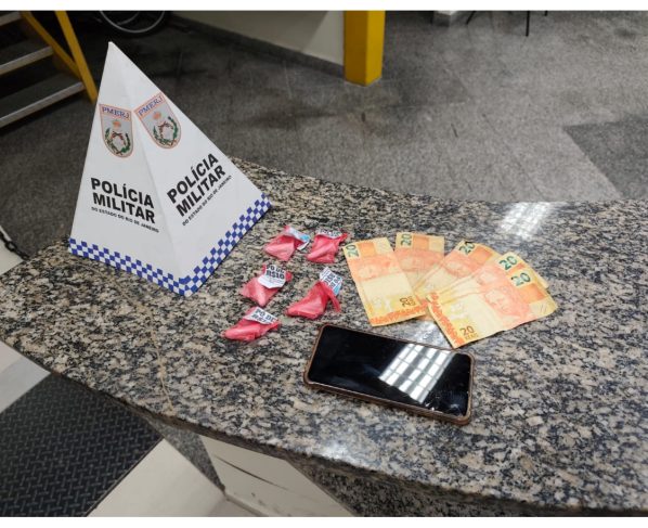Durante a revista, foram encontrados com o suspeito cinco pinos de cocaína, todos com a etiqueta “Pó de R$ 10”, totalizando aproximadamente 11 gramas da substância. Além do entorpecente, os agentes apreenderam um aparelho celular da marca Motorola, com a tela danificada, e a quantia de R$ 100,00 em dinheiro.
