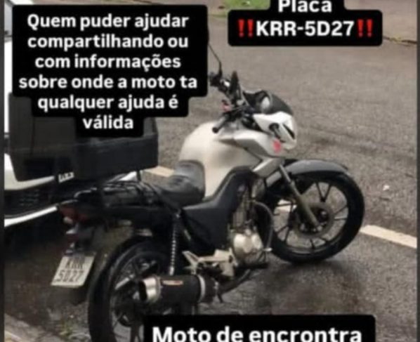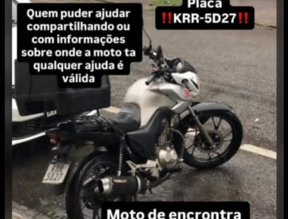 De acordo com o rapaz, de 21 anos, trata-se da moto Honda CG 160-KRR5D27. Ele contou que o crime aconteceu entre 3h e 4h, e foi registrado por câmeras de segurança, mostrando dois bandidos levando a moto. O jovem é motoboy e utiliza o veículo para trabalhar. Qualquer informação deve ser passada ao 190 da Polícia Militar.