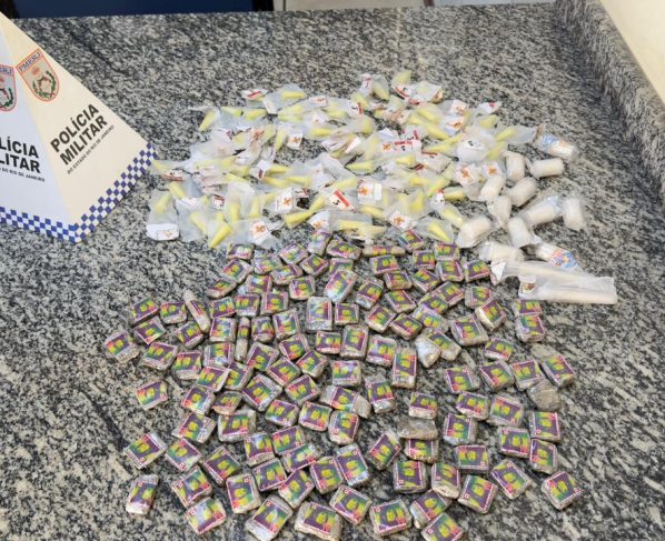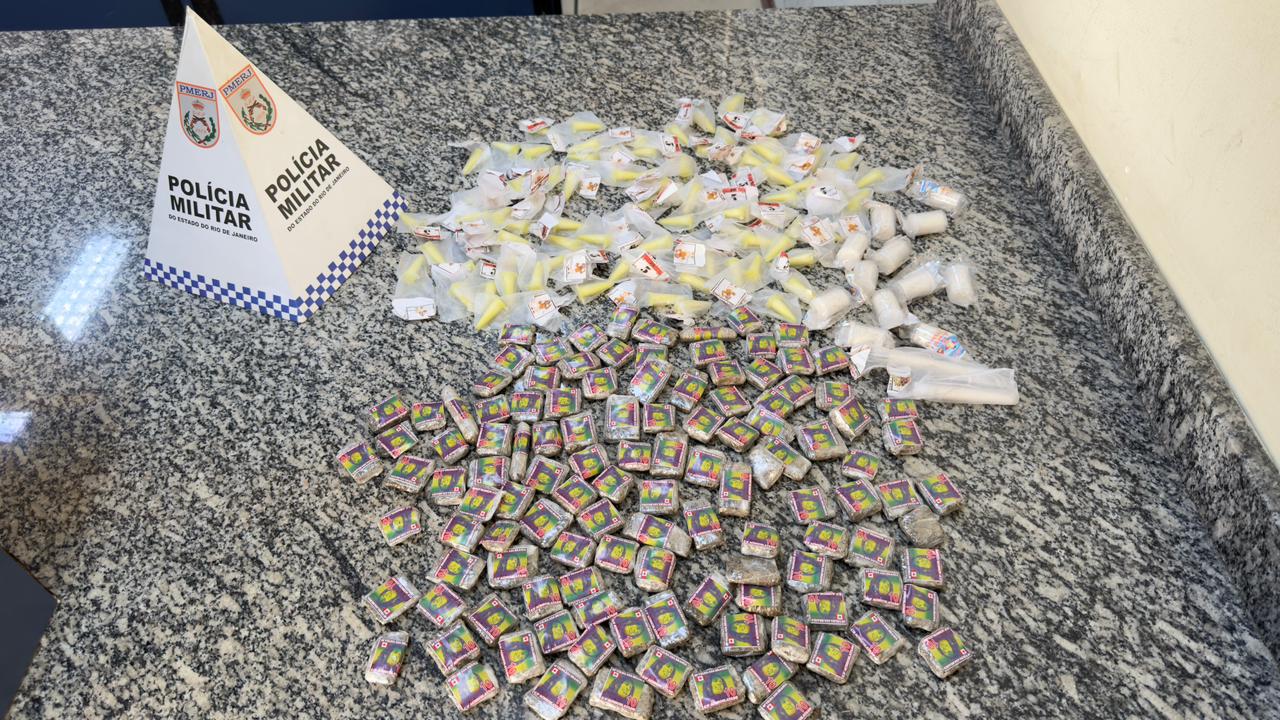 Durante as buscas, os agentes encontraram uma sacola contendo 93 gramas de cocaína, distribuídas em 93 pinos de diferentes valores, e 240 gramas de maconha, divididas em 120 embalagens.