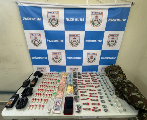Segundo a PM, durante a ação os agentes encontraram pinos de cocaína, trouxas de maconha e frascos de loló, além de dinheiro, rádios comunicadores e roupas camufladas. No momento desta publicação, não havia informações sobre como ficou a situação da dupla na delegacia. (Foto: PM/Divulgação)