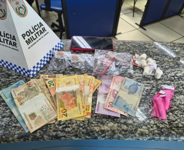 Após receberem denúncia sobre movimentação suspeita de tráfico de drogas em uma praça do bairro Jardim Real, os policiais foram até o local. Os agentes realizaram monitoramento com apoio do serviço reservado e observaram o suspeito retirando materiais de uma sacola plástica escondida sob uma árvore e entregando a frequentadores da praça, comportamento típico do comércio ilegal de entorpecentes. Durante a abordagem, os policiais encontraram com o suspeito um aparelho celular e a quantia de R$ 537 em dinheiro. Em buscas no ponto indicado, foram apreendidos sacola plástica com sete pinos de cocaína e três trouxinhas de maconha.