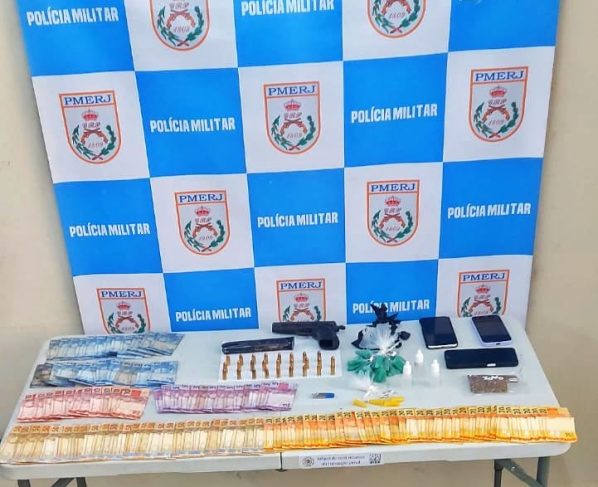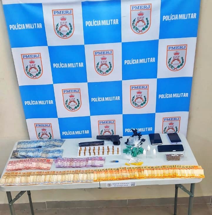 Na ação, os policiais apreenderam uma pistola Luger M95 Detective, um carregador com capacidade para 30 munições, 26 munições calibre 9mm, 40 pinos de cocaína, 11 pedaços de maconha, três frascos de substância conhecida como “loló” e a quantia de R$ 2.360 em dinheiro.